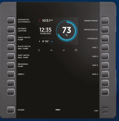 An elegant combination of tactile buttons and a digital display. The aluminium casing and optically bonded display give the control panel a high-end look that complement the interior of your boat or yacht.